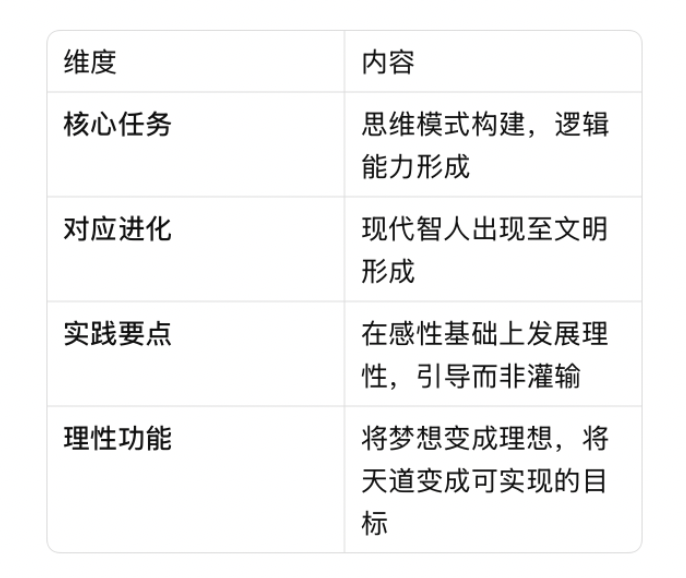 - 在感性基础上发展理性:不割裂、不超前